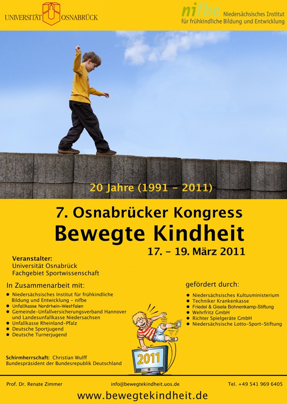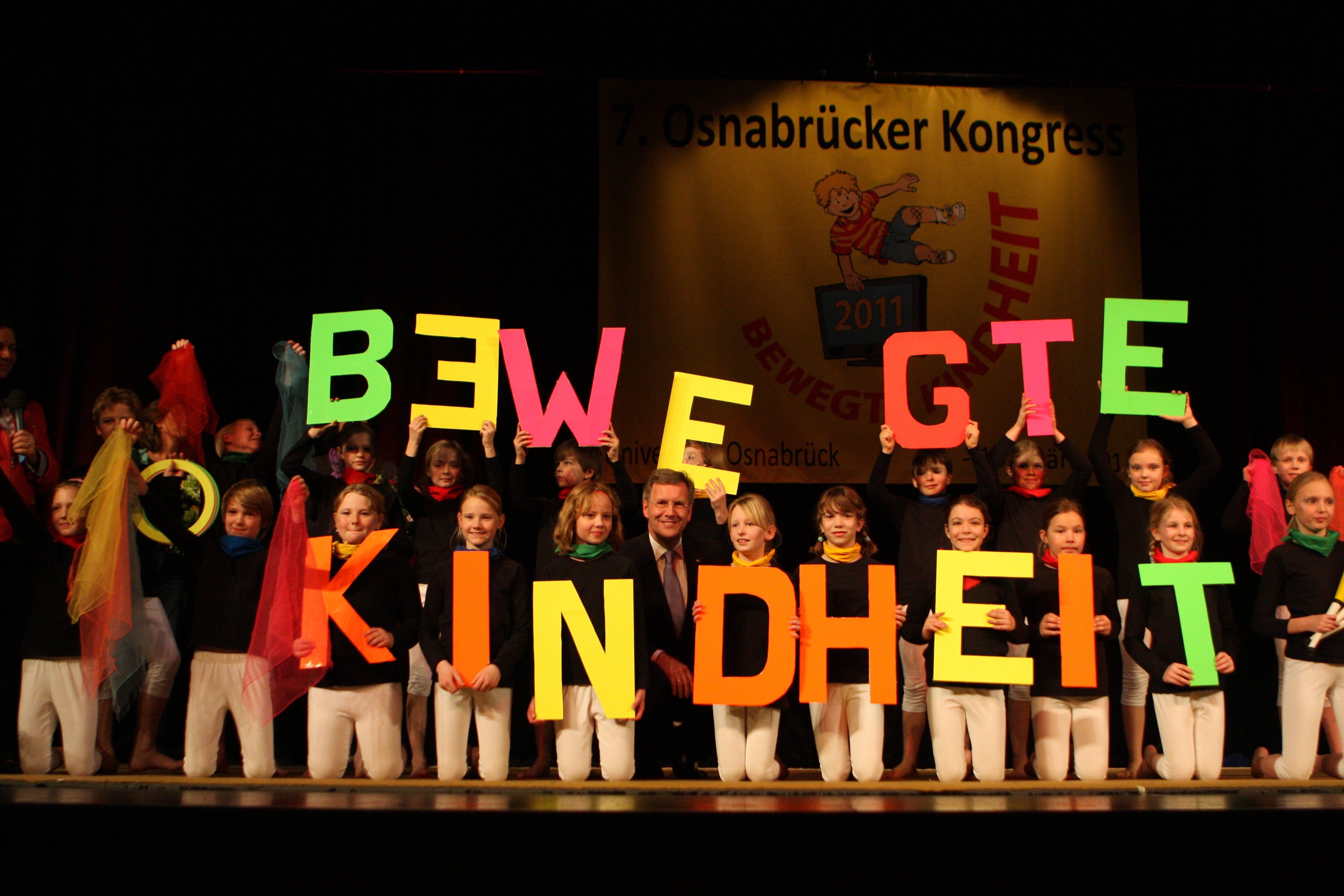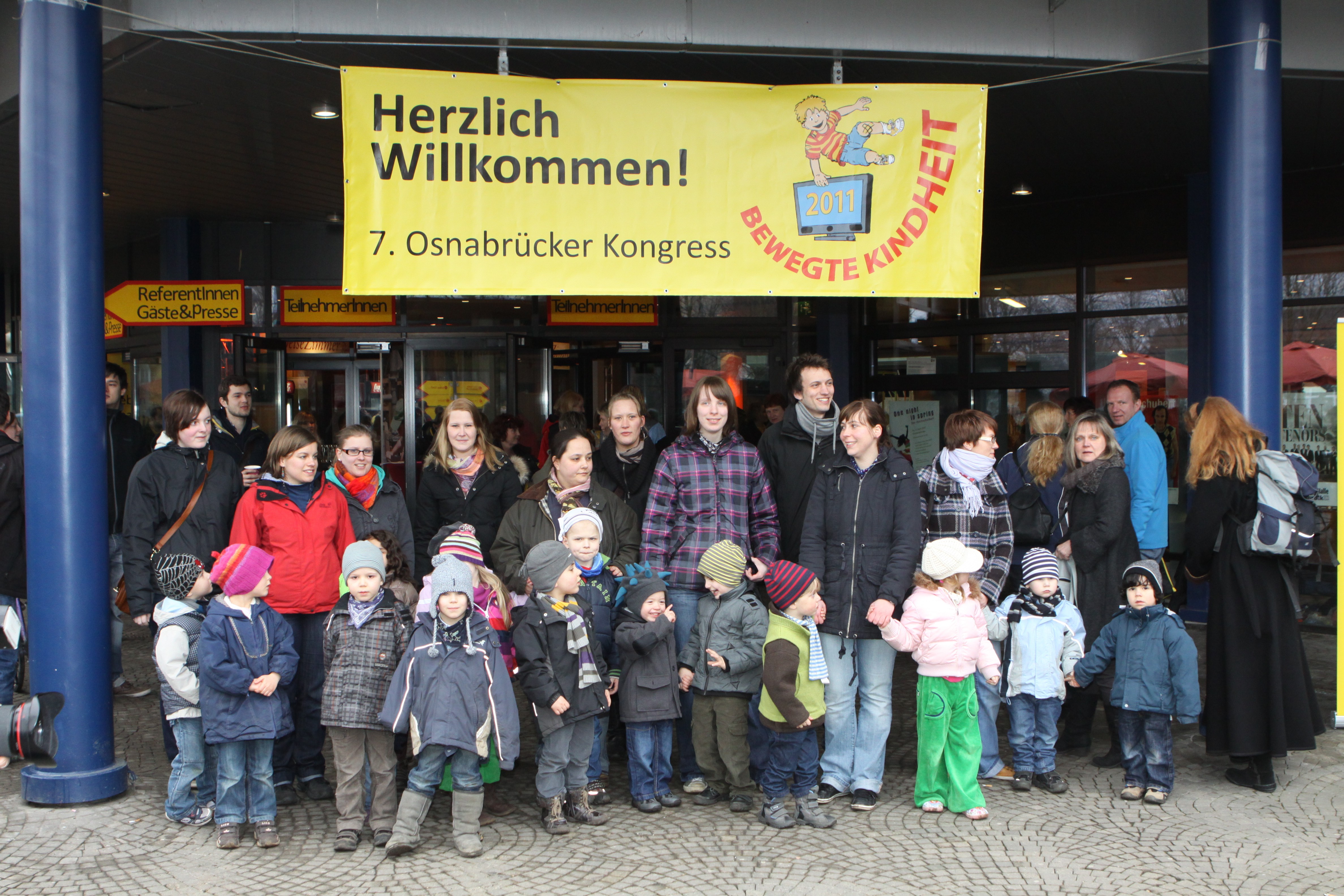 Der 7. Osnabrücker Kongress "Bewegte Kindheit" ist beendet. Mit 3.000 Teilnehmerinnen und Teilnehmern aus ganz Deutschland, aber auch aus vielen europäischen und sogar aus asiatischen Ländern hat er eine Dimension erreicht, die uns vor große Herausforderungen stellte. Wir freuen uns sehr, dass der Kongress sehr erfolgreich verlaufen ist. Die Eröffnung durch den Bundespräsidenten Christian Wulff war für uns eine große Anerkennung, sie setzte einen besonderen bildungspolitischen Akzent. Wir bedanken uns bei den Referentinnen und Referenten, bei den Fachausstellern und Helfer/innen, die durch ihr Engagement und ihren großartigen Einsatz maßgeblich zum Erfolg des Kongresses beigetragen haben. Bedanken möchten wir uns auch bei den Teilnehmerinnen und Teilnehmern, die mit ihrer Begeisterung und ihrem Interesse die fröhliche und fachlich anregende Atmosphäre bestimmten. Ein großer Dank gilt unseren Kooperationspartnern und den Förderern des Kongresses!